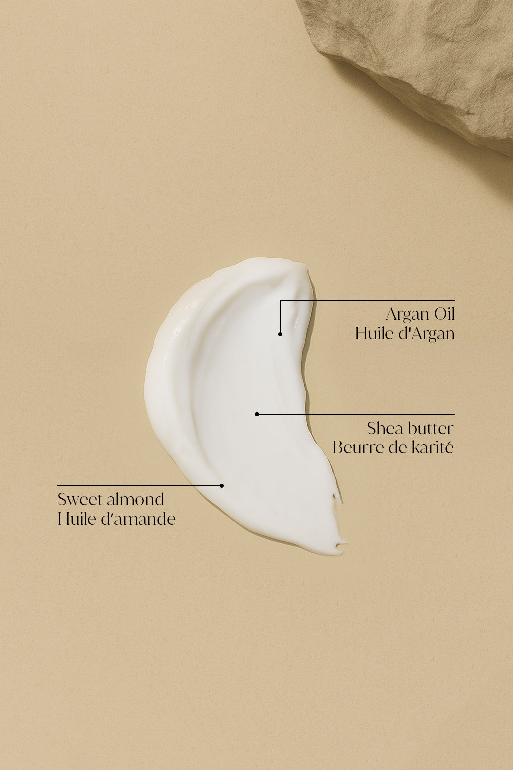 ماء، كحول سيتياريل (و) ثنائي بالميتويليثيل هيدروكسي إيثيل مونيوم ميثوسلفات (و) سيتريث-20، عطر، كلوريد بولي أكريلاميدوبروبيل تريمونيوم، زيت نواة أرغانيا سبينوزا، دايميثيكون، زبدة بوتيروسبيرموم باركي، زيت برونوس أميجدالوس دولسيس، ميريستات إيزوبروبيل، كحول بنزيل، بنزوات الصوديوم، سوربات البوتاسيوم، حمض ديهيدروأسيتيك، سيترونيلول، لينالول، ليمونين.