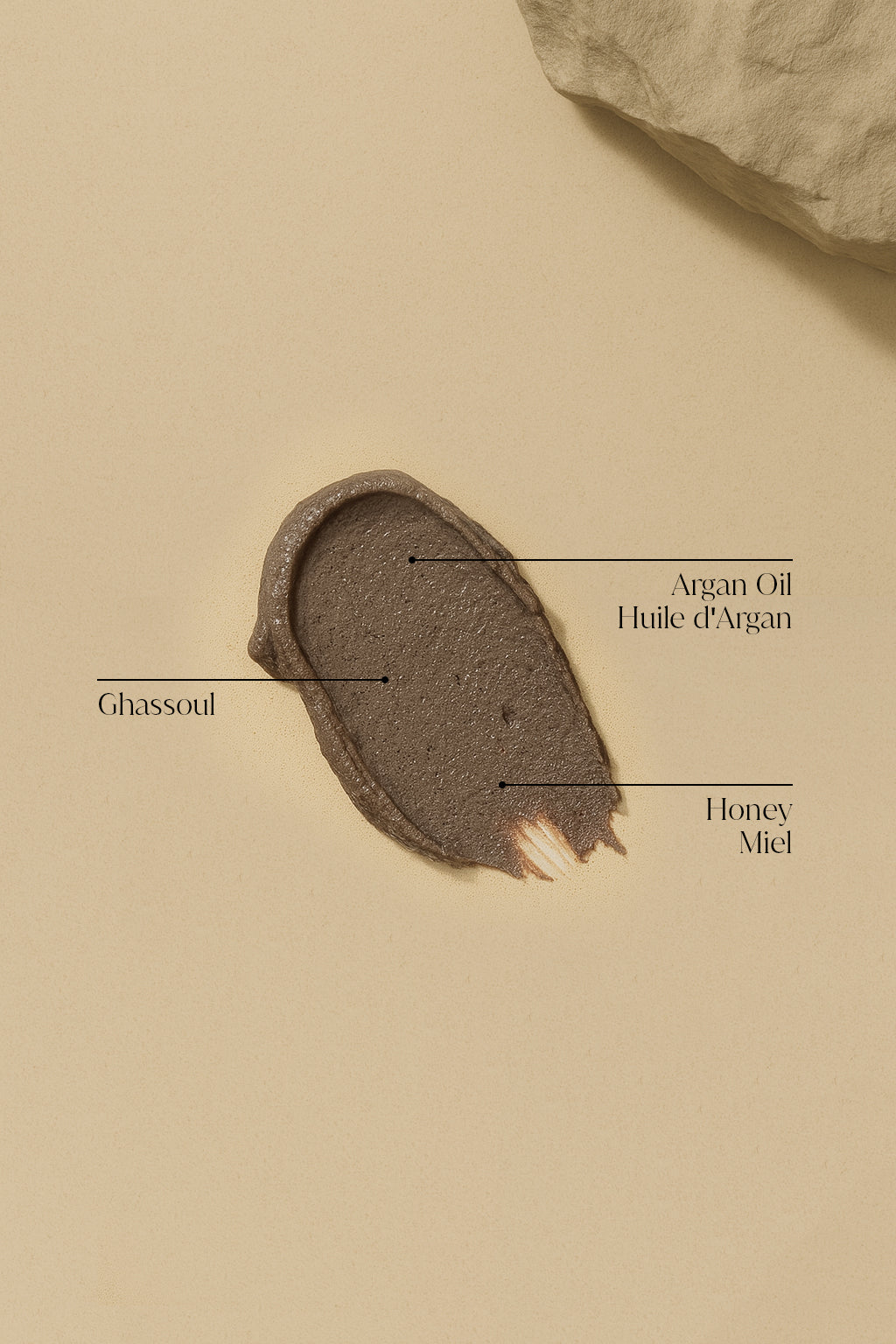 الغاسول (طين الحمم البركانية المغربي) يُنقّي البشرة بعمق بامتصاص الشوائب والزيوت الزائدة دون المساس بتوازنها الطبيعي. غني بالمعادن، يُقشّر البشرة بلطف، ويُضيّق المسام، ويُعيد إليها صفاءها ونعومتها، ليتركها ناعمة ومنتعشة ومشرقة.