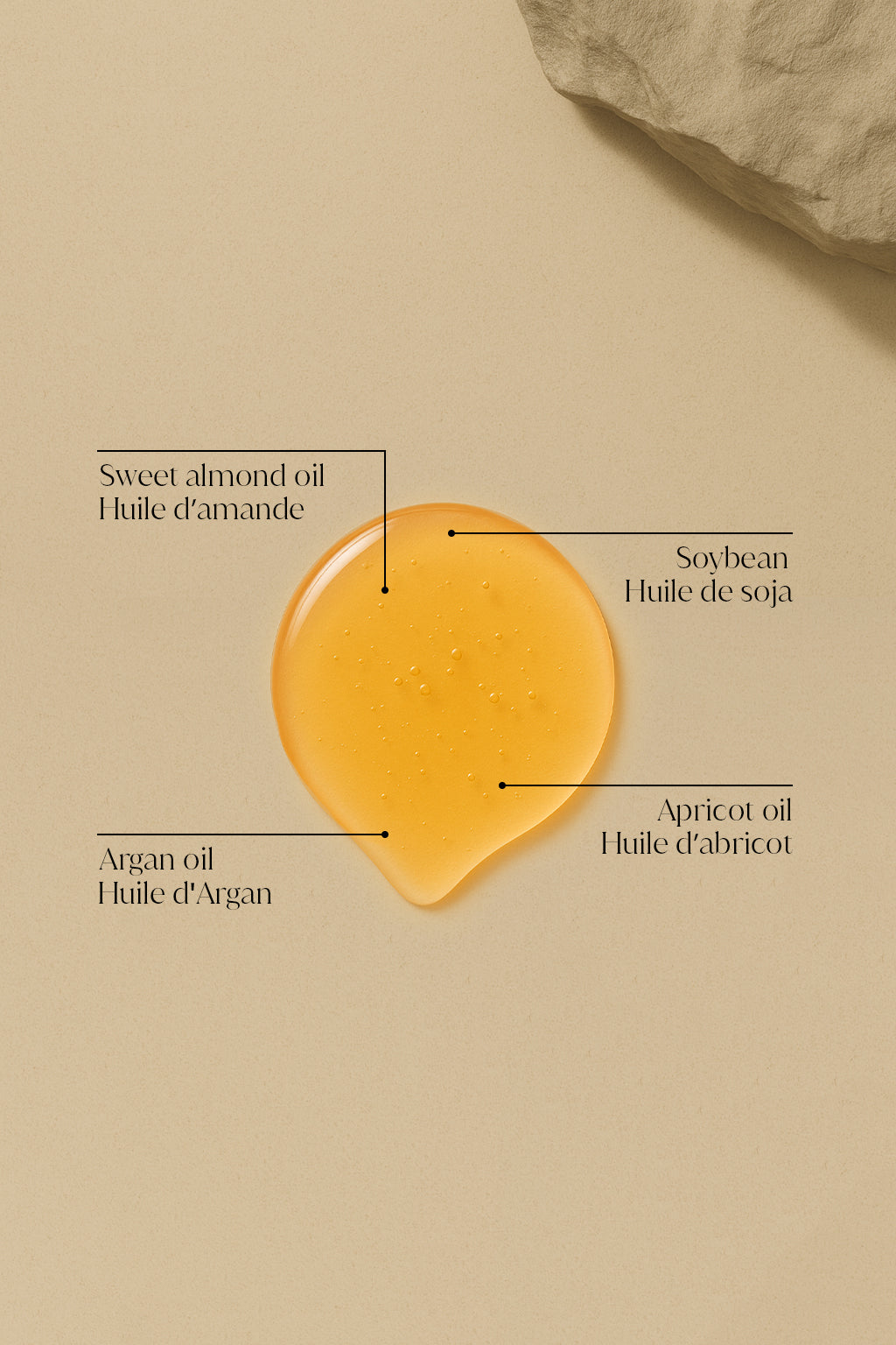 زيت برونوس أميجدالوس دولسيس، زيت فول الصويا (جليسين سوجا)، ميريستات إيزوبروبيل، زيت نواة أرغانيا سبينوزا، زيت نواة برونوس أرمينياكا (المشمش)، عطر، أسيتات دل-ألفا توكوفيريل، هيكسيل سينامال.